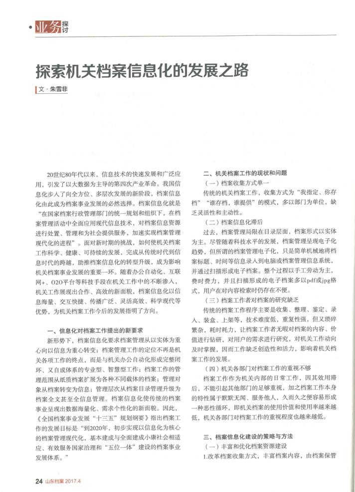 《山东档案》2017年第4期刊发我厅报送的《探索机关档案信息化的发展之路》