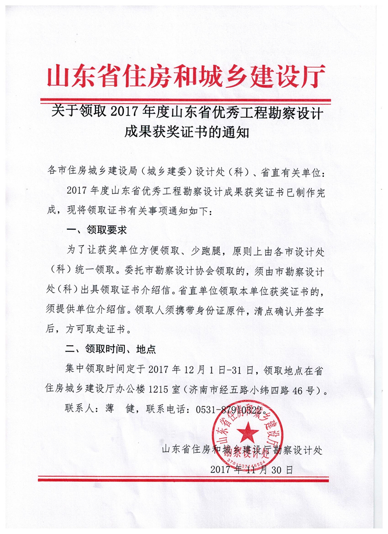 关于领取2017年度山东省优秀工程勘察设计成果获奖证书的通知